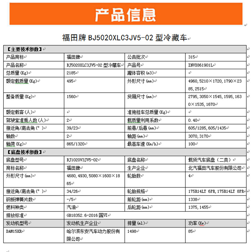 福田時代祥菱V冷藏車,1600車身,整車型號:BJ5020XLC3JV5-02,底盤型號:BJ1020V3JV5-02,整車尺寸:4960*1720*2515,箱體尺寸:2795*1545*1535,東安KAM15KR發動機,116馬力,5檔箱,DAT18R-5擋變速箱,總質量:2185kg,整備質量:1560kg,額定載質量:495kg,3070軸距,175R14LT輪胎,102后橋,ABS,電動助力轉向、中控鎖,電動玻璃,、前穩定桿、皮革座椅。